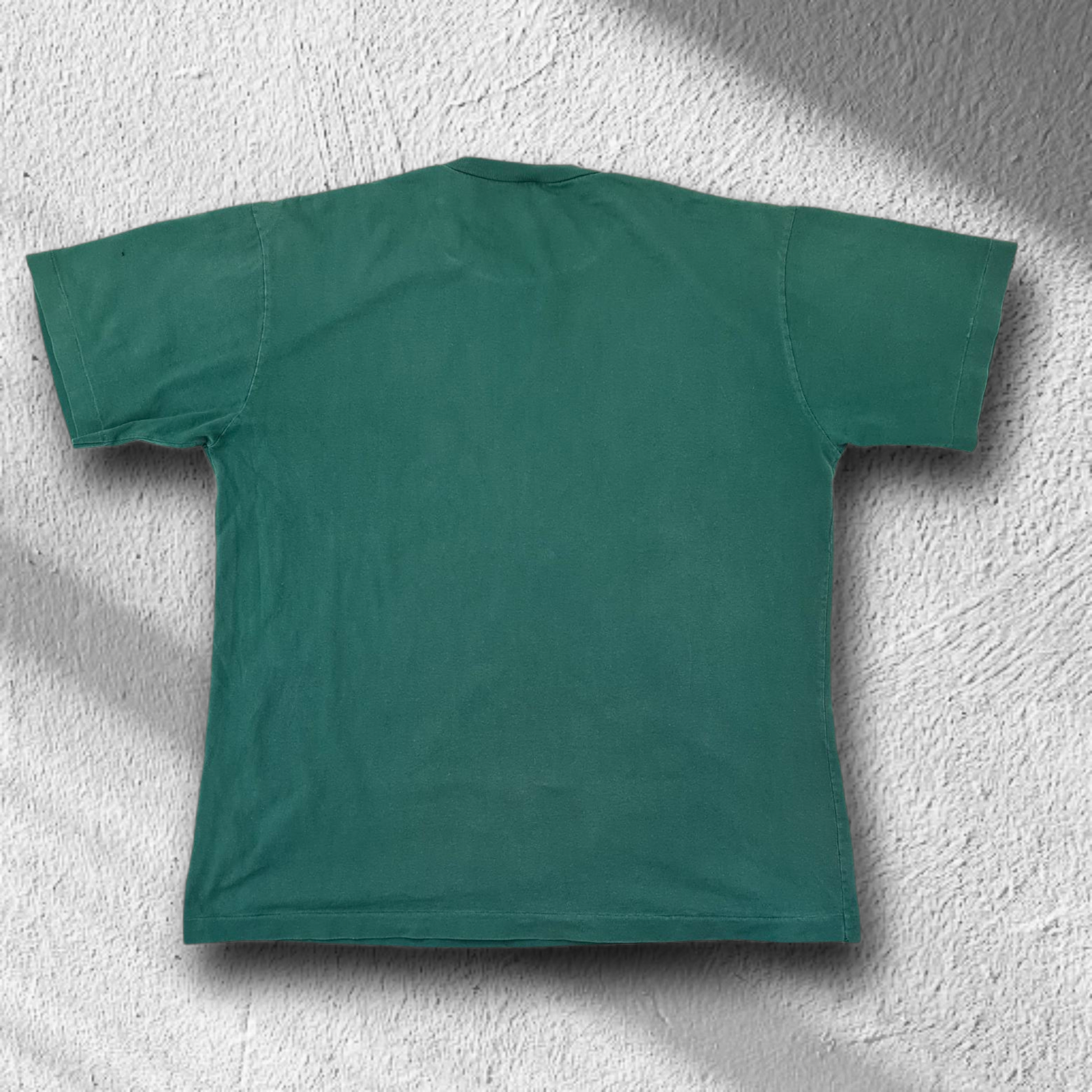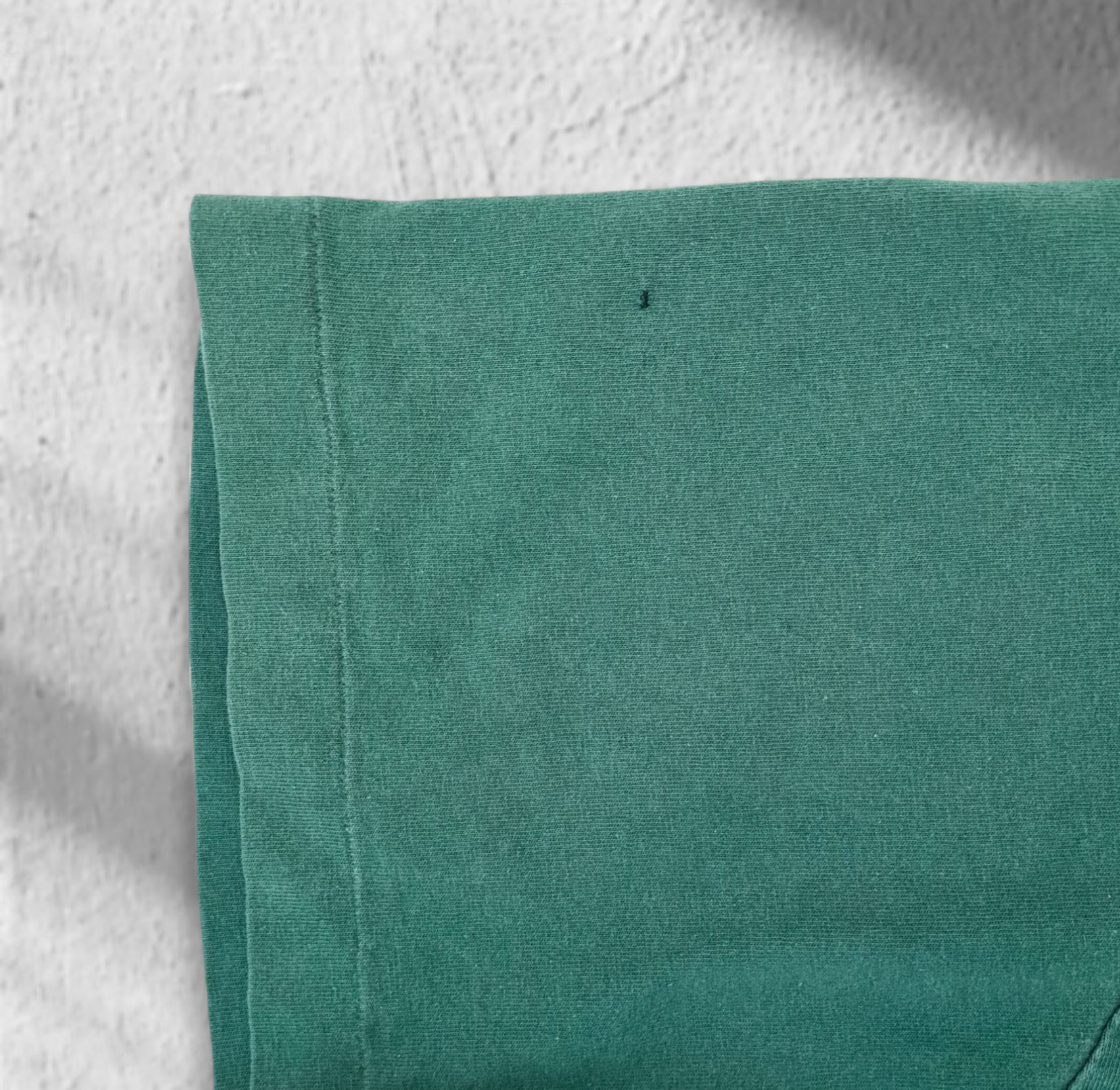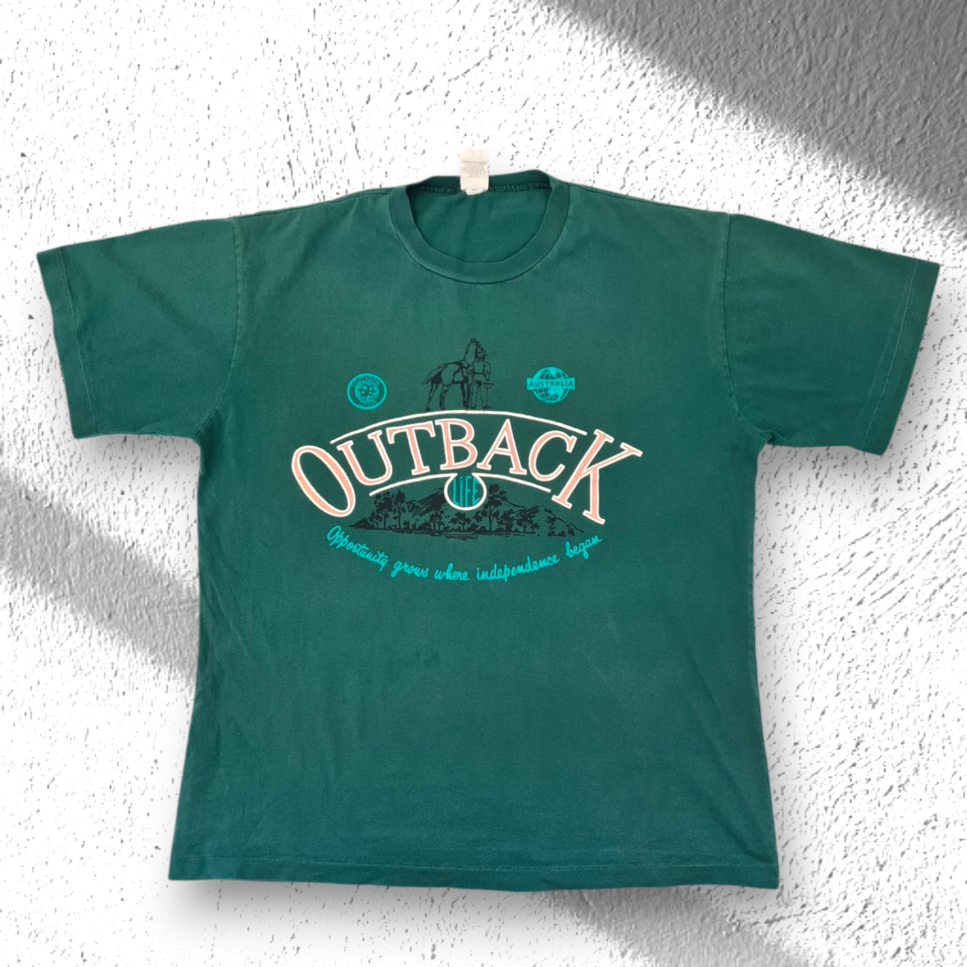 Das seltene Outback Life Design ist ein absoluter Hingucker — gedruckt auf weicher, angenehm gealterter Baumwolle im satten Dunkelgrün. Klassischer Single-Stitch-Saum an Ärmeln und Bund unterstreicht die Authentizität und den Vintage-Charakter.