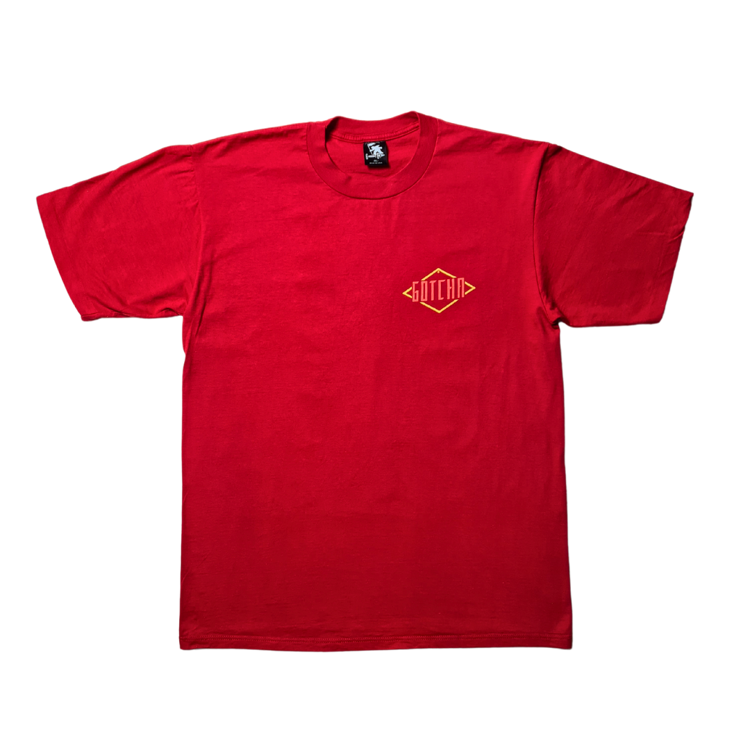 Knallrotes Single Stitch T-Shirt der Kultmarke Gotcha, made in USA. Rückseitig mit auffälligem Tribal-inspiriertem Backprint in Neonfarben (Grün, Gelb, Orange) und großem „Gotcha“-Logo. Vorderseitig kleines Gotcha-Logo in Gelb-Rot. Klassischer Rundhals, Single Stitch an den Ärmeln, kein Single Stitch am Bund – echtes 90s Vibe-Piece.