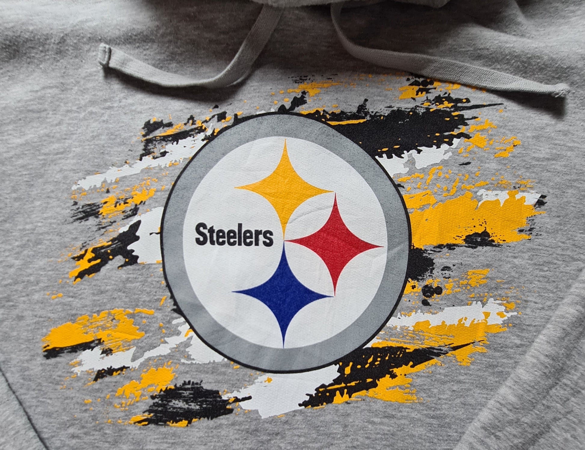 NFL-Fanwear von Fanatics: Grauer Hoodie mit großem „Pittsburgh Steelers“ Logo und gelb-weißen Brushstroke-Details. Offizieller NFL-Style für echte Football-Fans.