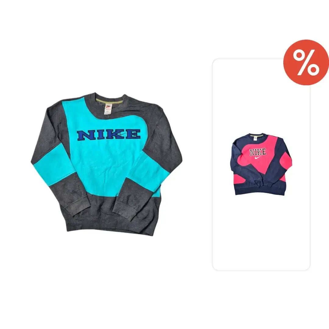 Sichere dir dieses exklusive Bundle mit zwei Nike-inspirierten Rework-Sweatern! Der Sweater im zweifarbigen Colorblock-Design in Dunkelgrau und Türkisblau ist ein echter Eyecatcher für Streetwear-Fans und in sehr gepflegtem Zustand. Kombiniere ihn mit Baggy Jeans und Air Force 1 für den lässigen Vintage-Streetstyle. Das zweite Piece besticht durch kräftiges Pink und Navyblau, ein gesticktes Nike-Logo und ikonische Ellbogenpatches. Trage ihn oversize zu Mom-Jeans und Nike Sneakern für einen coolen Look. Beide Sweater bieten Style & Qualität zu einem fairen Preis – sichere dir dieses Unique Bundle jetzt!