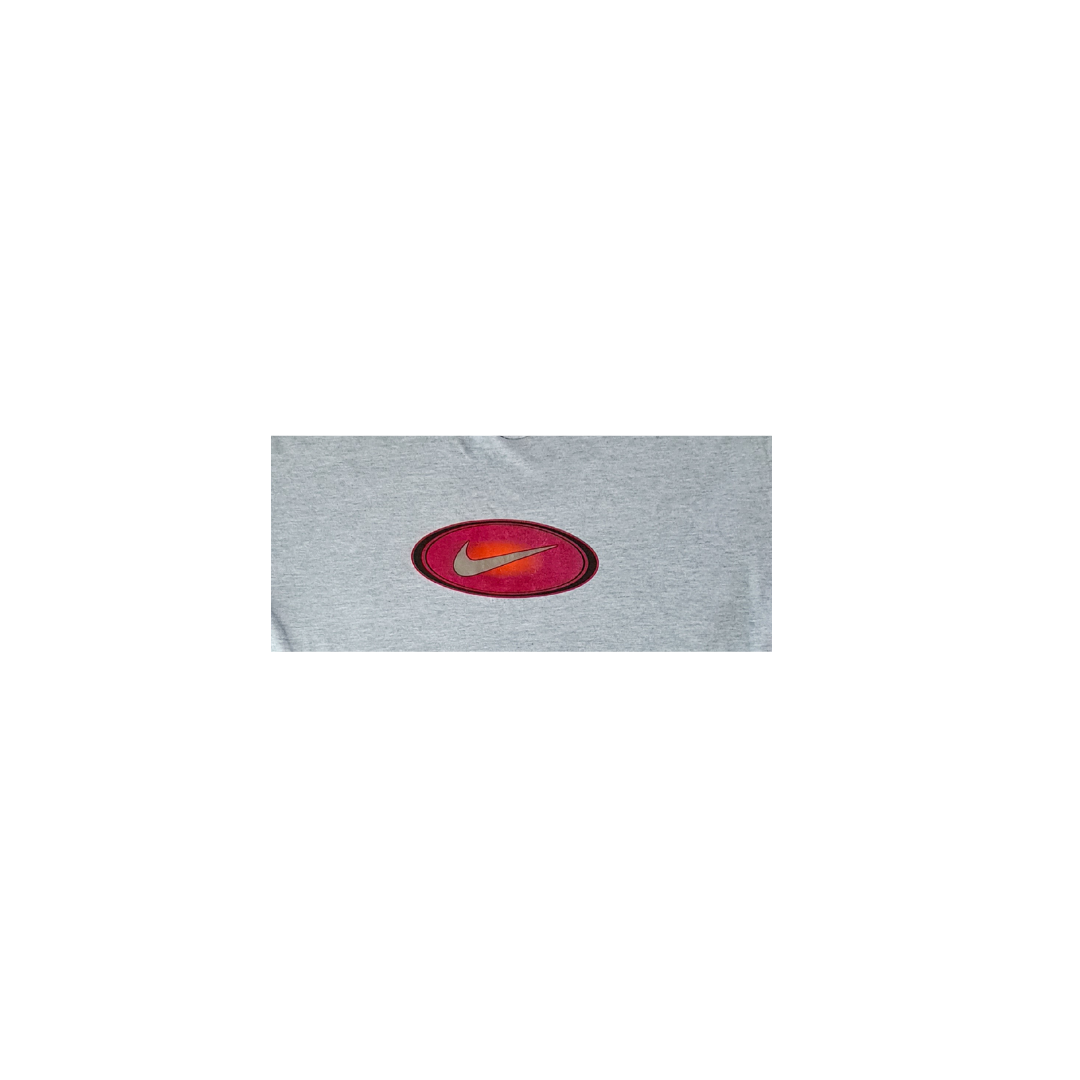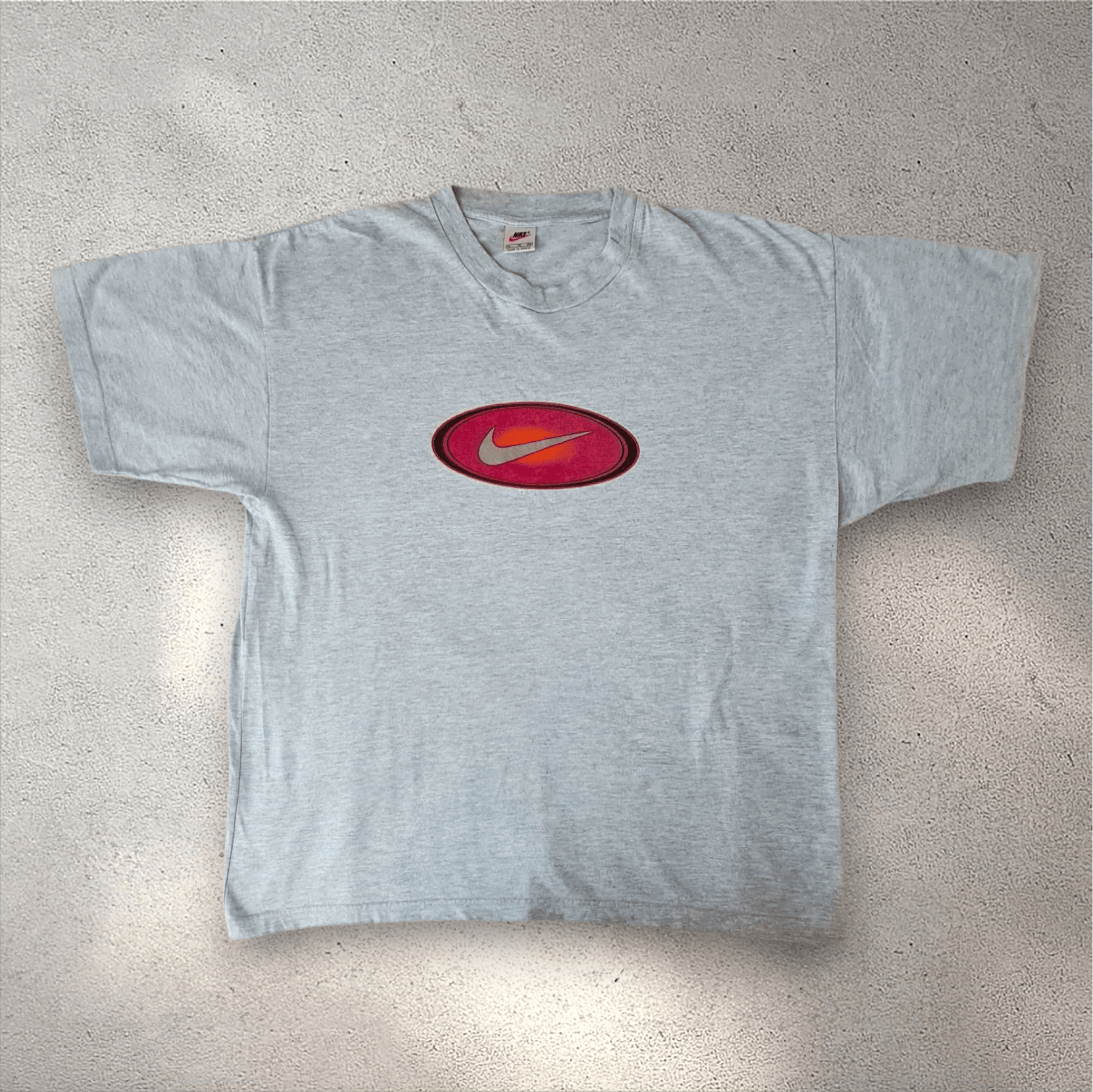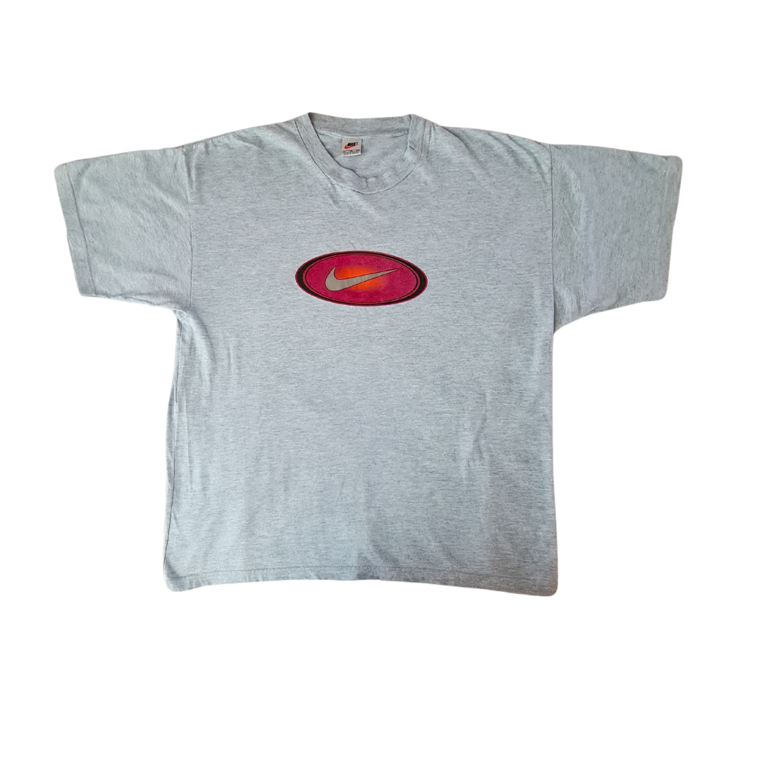 Seltenes Vintage Nike T-Shirt aus den 90s – made in Greece! Klassisches graues Nike Shirt mit auffälligem rotem Swoosh-Logo im ovalen Design. Lässiger Oversized Fit – perfekt für Streetwear-Looks. Weiche Baumwolle, top erhalten – ein echtes Retro Nike Highlight für Sammler*innen & Fashion-Fans.