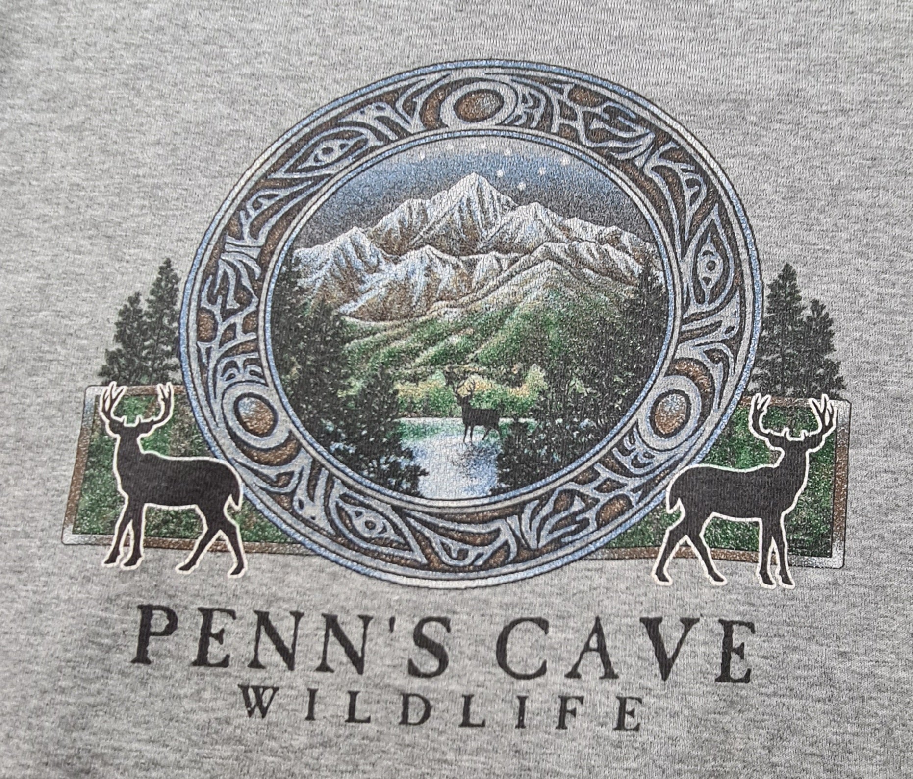 Seltenes Souvenir-Sweatshirt aus Penn’s Cave, Pennsylvania (USA). Klassischer Heather Grey Pullover mit großem Wildlife-Frontprint: Berglandschaft, Wald und Hirsche eingerahmt in Tribal-Ornamente. Ein Highlight für Fans von Destination Wear und US-Touristwear der 90er/2000er.