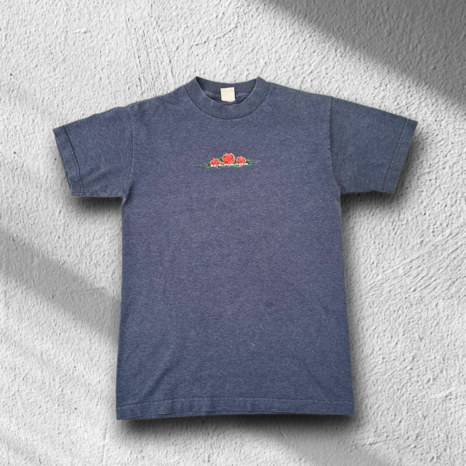 Dunkelblaues T&C Surf Designs Hawaii Tee mit kleinem Rosenstick vorn und großem Dolch-mit-Rosen-Print hinten – auffällig, aber tragbar. Klassischer Rundhalsausschnitt, doppelt genähter Saum (kein Single Stitch), stabil und bequem. Das Shirt stammt aus der Retro-Ära und vereint Surf-Vibes mit Tattoo-Ästhetik.