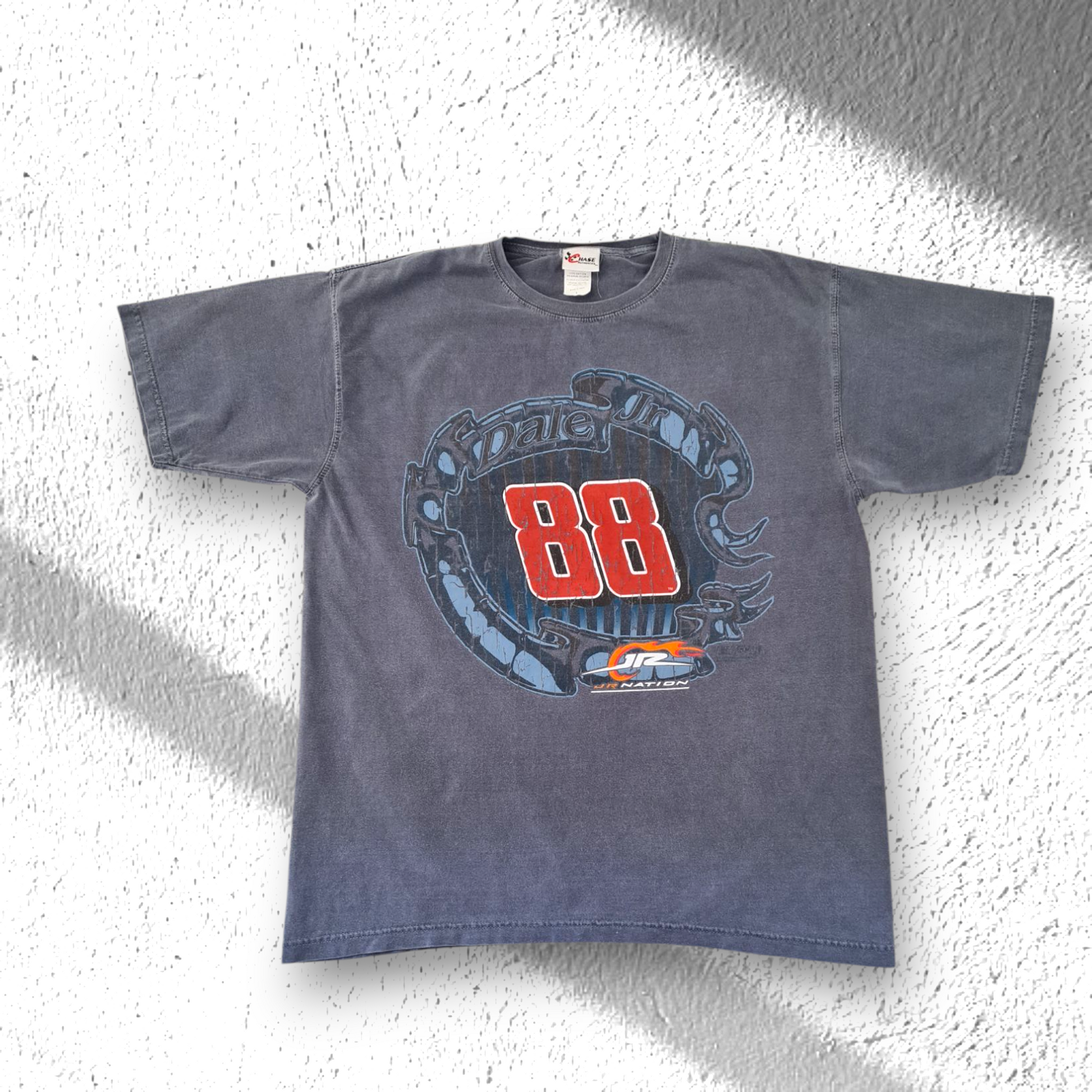 Original Vintage Graphic T-Shirt von Chase Authentics mit großem "Dale Jr. 88" Frontprint — ein Must-have für alle Racing- und Motorsport-Fans, die auffällige 90er-Jahre Grafik-Shirts lieben. Das Shirt kommt in verwaschenem Grau und überzeugt durch einen kräftigen, großflächigen Frontprint im NASCAR-Look.