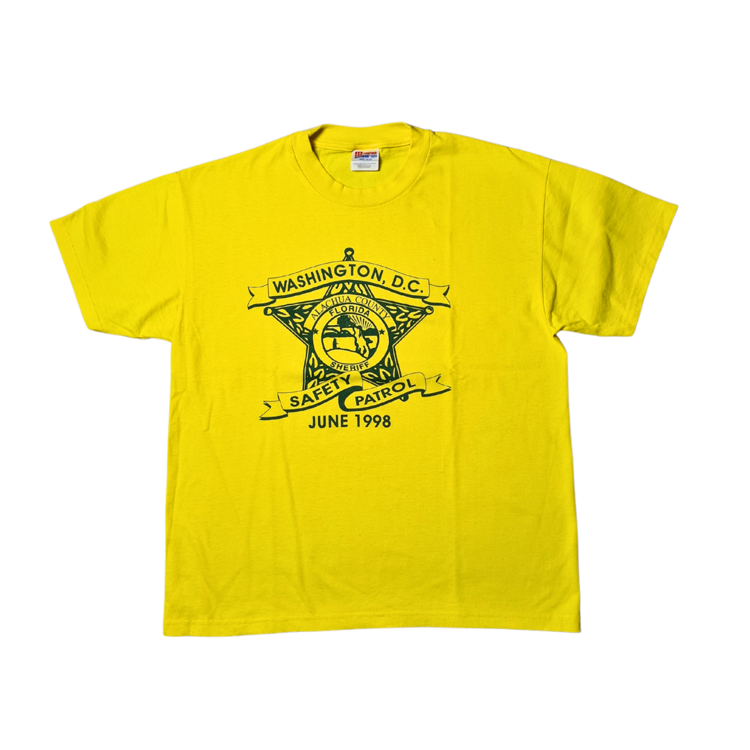 Das sonnengelbe Hanes Heavyweight T-Shirt in Größe L überzeugt mit einem einzigartigen Sheriff-Badge-Print: „Washington, D.C. – Alachua County, Florida – Safety Patrol – June 1998“. Ein Statement-Piece mit History-Vibe!